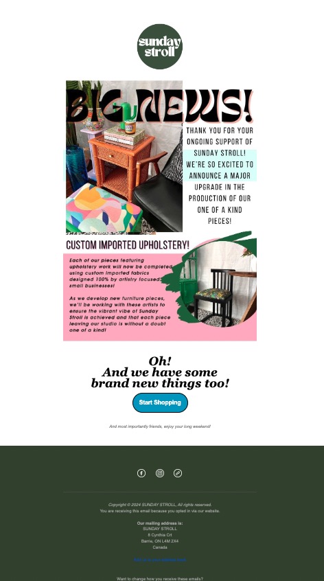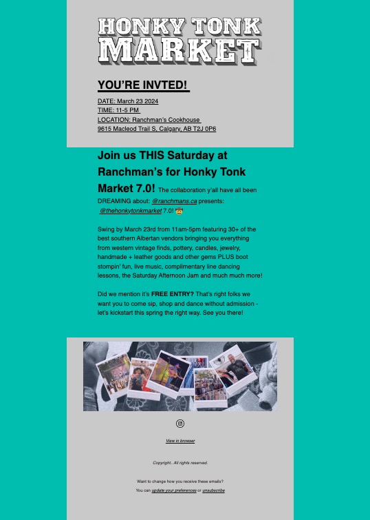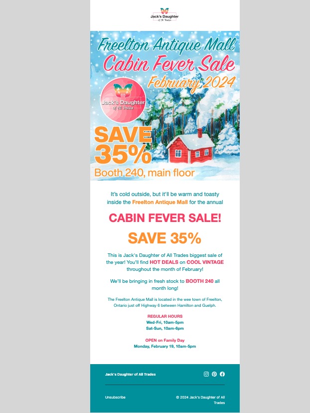 Your emails are a place to promote your shop URL, your social media pages, your website, etc. Don’t be shy — include them all in the footer and the most important ones in the header — but feature one main call to action (CTA) or thing you want your potential customers to do via a button.