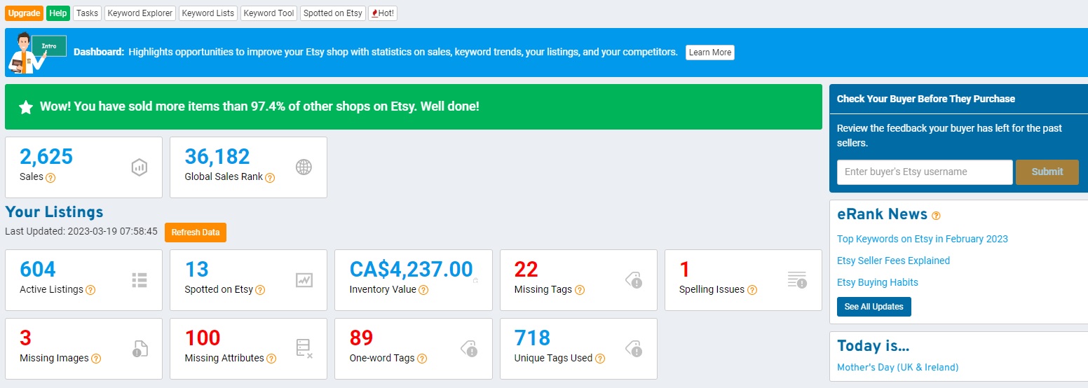 The site has many features to help improve your shop. What I am sharing is from the free plan and linked to my Etsy shop, LemonsLoot. If you don’t have an Etsy shop, there is still a ton of information on SEO/keywords, marketplace insights, shopper trends, calendar dates, profit calculators and more.