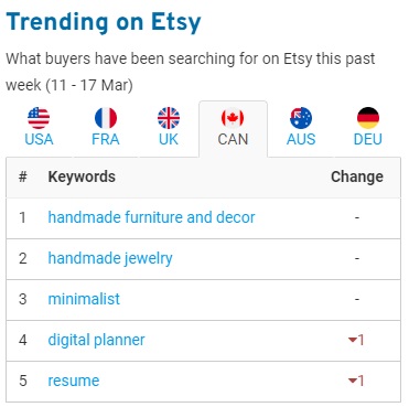There is updated information per week and per month (this is sorted by category, I selected vintage for the example). This gives you a quick look into what customers are searching for based on keywords.